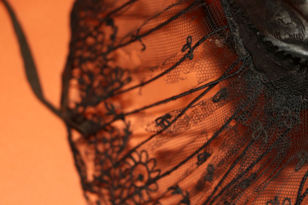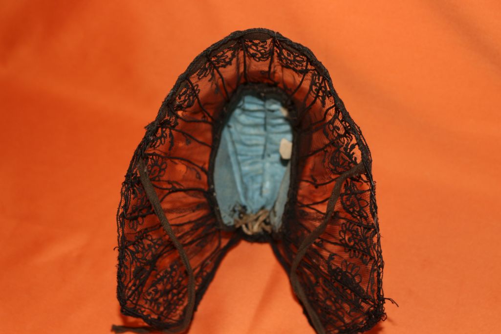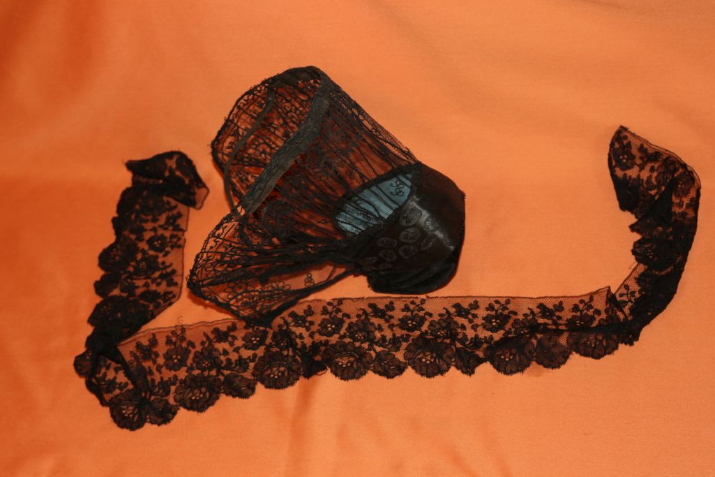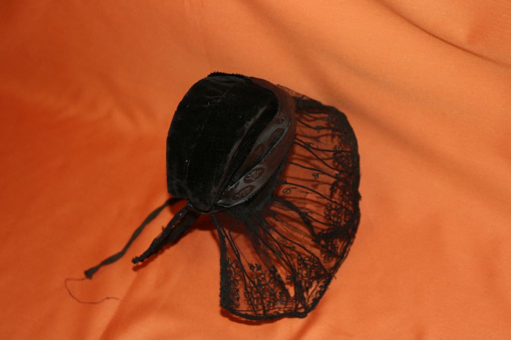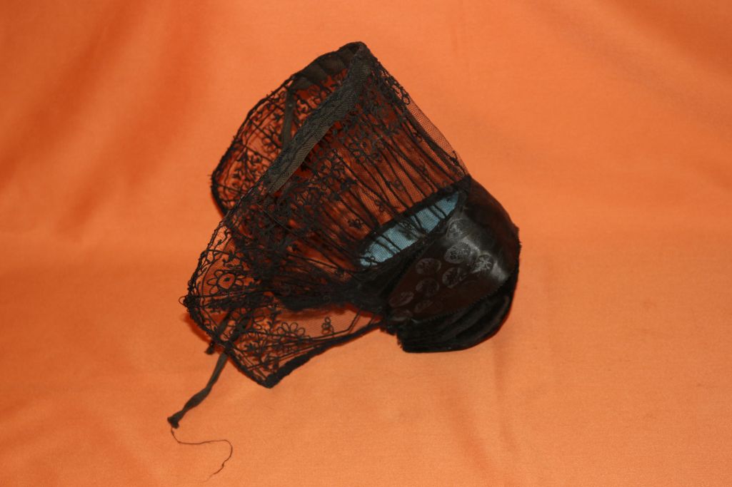 Ich verkaufe hier eine antike Trachten bzw. Trauerhaube mit feiner Spitze am Drahtgeflecht und vermutlich Samt am Ende. Weiters ist eine Schleife aus Spitze dabei. Innen in der Haube steht noch ein Name „Zmölnig“.