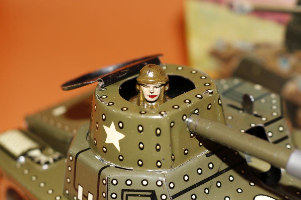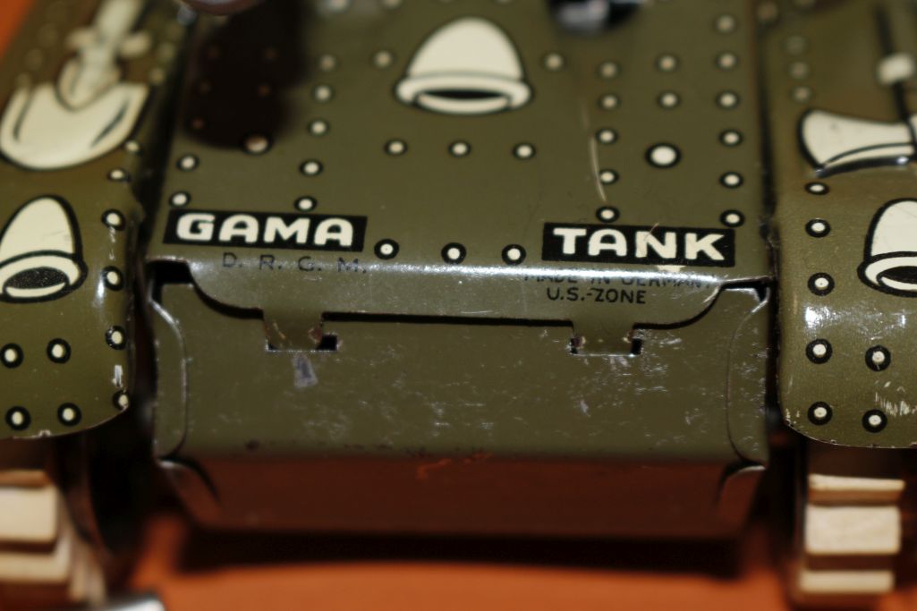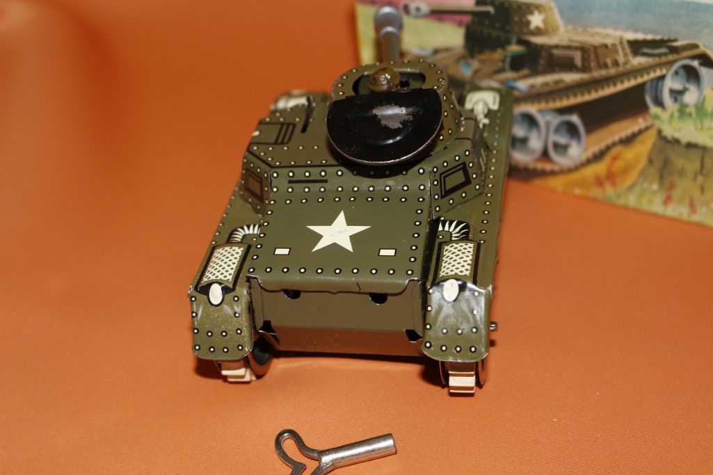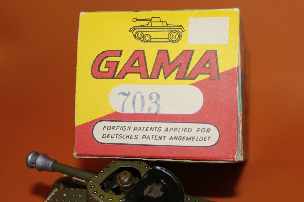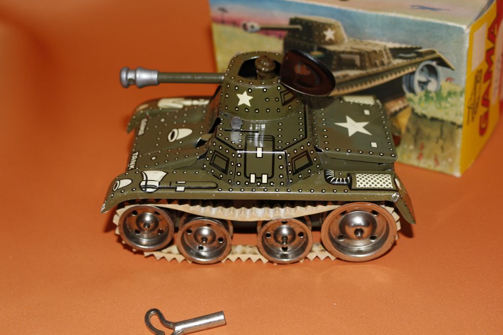 Ich verkaufe hier einen schönen, alten Panzer von der Firma Gama, den Gama 703 im original Karton inkl. Aufziehschlüssel. Der Panzer selbst ist in gutem Zustand, das Uhrwerk funktioniert gut, lediglich die Ketten sind etwas gedehnt, dass die Räder den Gummi nicht mehr drehen können. Also neue Ketten sind von nöten!