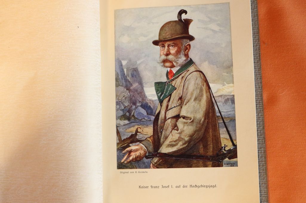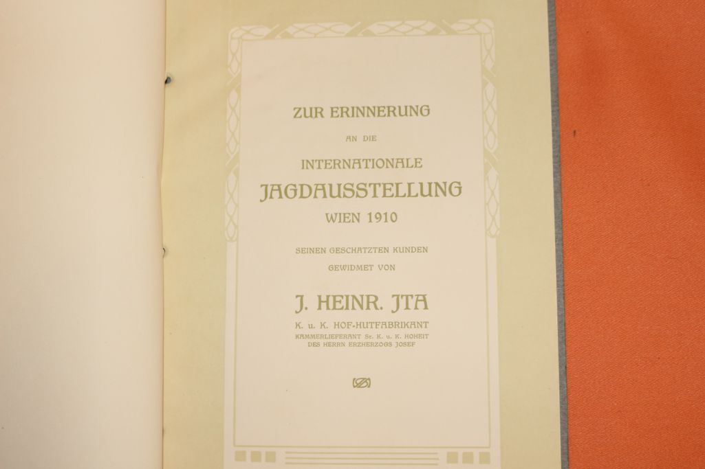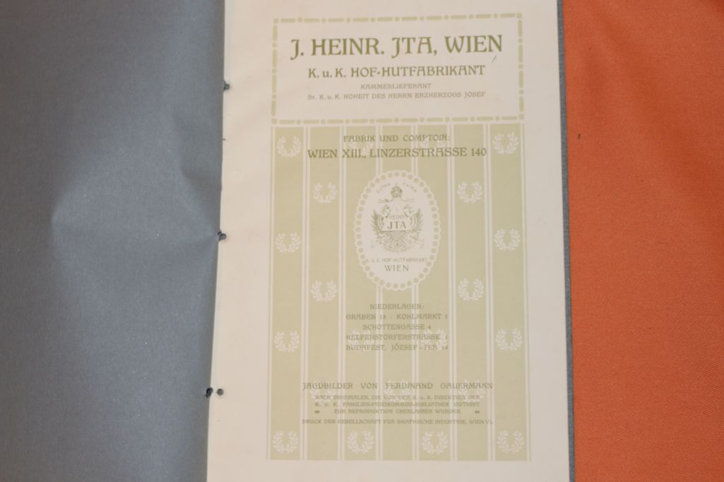 K&K Hof-Hutfabrikant Heinrich Ita. Ein wunderschöner Kartoneinband mit dem goldenen K&K Adler und innen ein Heftchen mit Kaiser Franz Josef und einigen jagdlichen Bildern, geschützt mit Spinnenpapier in Top Zustand. Leider dürfte ein Teil des Heftchens fehlen. Die Schnurbindung fehlt, ca. 12 Seiten sind vorhanden.