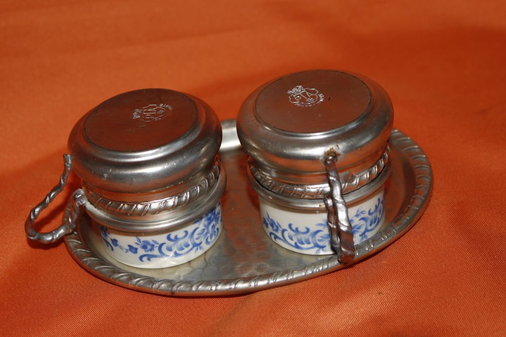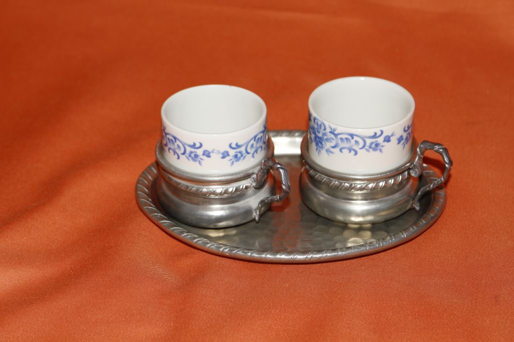 Ich verkaufe hier ein altes Mocca Set bestehend aus 2 Keramiktassen in sehr gutem Zustand von Weidmann Porzellan aus Italien, 2 Zinnhalter für die Tassen und ein kleines Tablett aus Zinn (jeweils von der Firma Peltri D’arte)